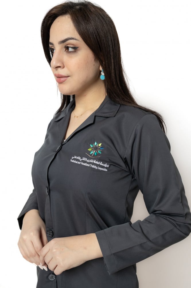 لبس الكلية التقنية للبنات مصنوع من خامات ذات جودة عالية متين، مريح، و عملي يأتي بمقاسات متنوعة مما يجعله مناسبًا للجميع.